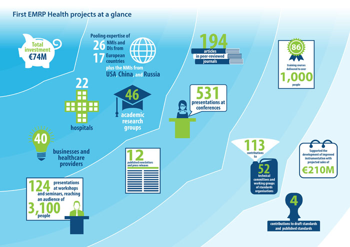 The health projects funded under the EURAMET research programmes, EMRP and EMPIR, have brought together research groups from metrology institutes, academia, industry and clinicians to work collaboratively. These address the provision of accurate measurements to support healthcare in Europe. The EMRP health projects have been completed and highlights are available here. The EMPIR health projects are in progress and will be completed in 2019.