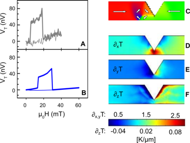 Graph A shows the first experimental evidence of the thermoelectrical signature of a single magnetic domain wall in a temperature gradient. The signal can be very well described by the anisotropic magneto-Seebeck effect (Graph B)