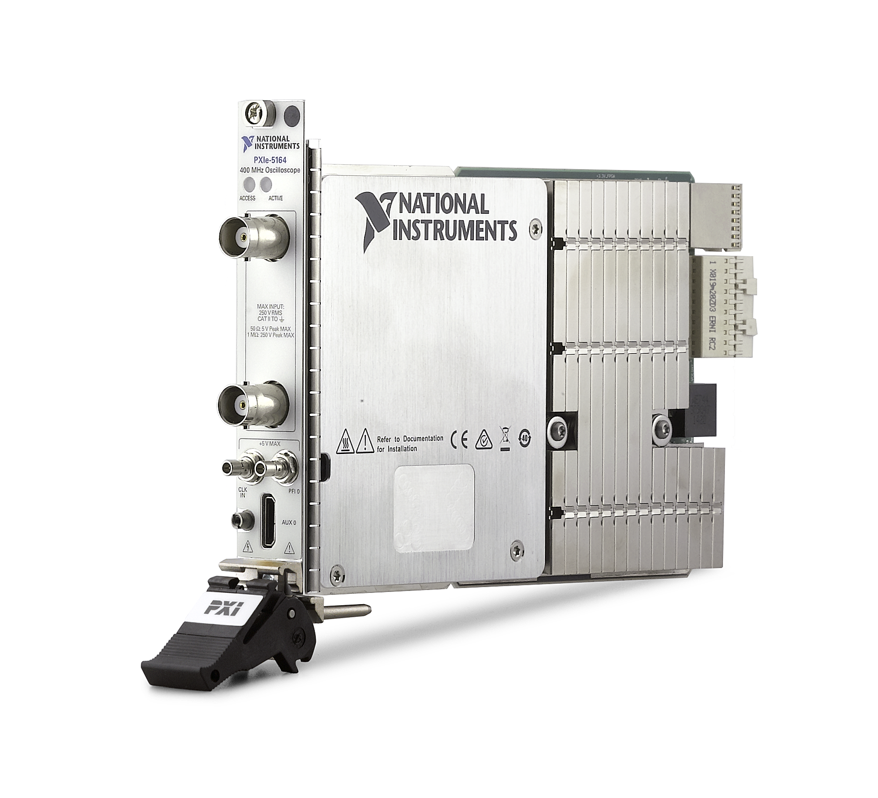 The PXIe-5164 oscilloscope giving unprecedented 14-bit resolution, 400 MHz of bandwidth, and the signal flexibility to measure up to 250 V inputs while offering a user-programmable, Kintex-7 Xilinx FPGA
