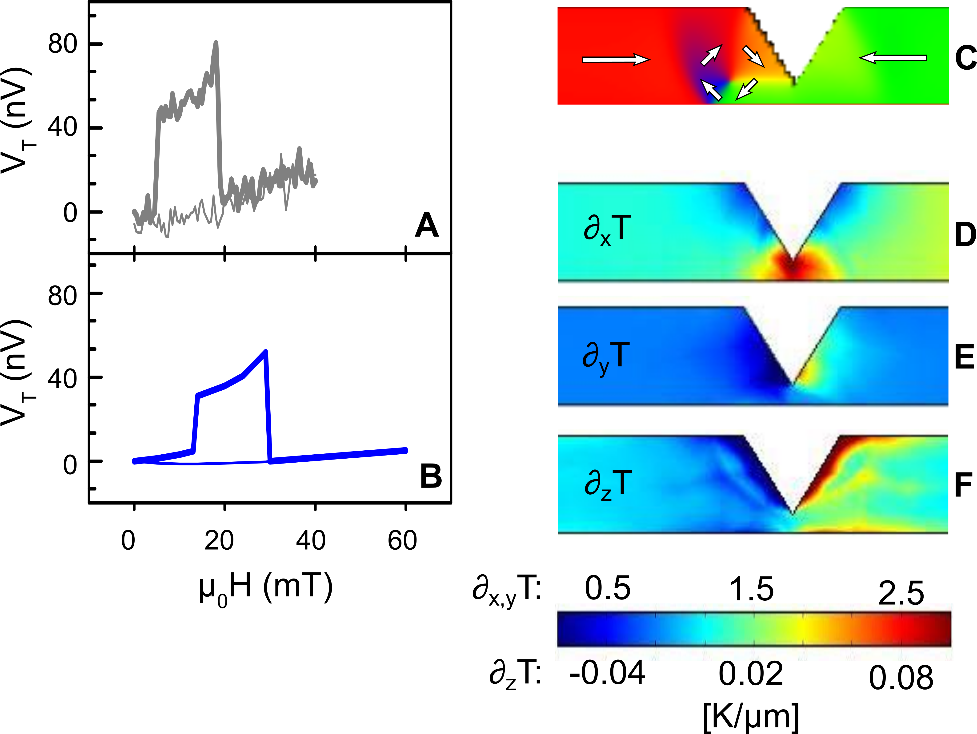 Graph A shows the first experimental evidence of the thermoelectrical signature of a single magnetic domain wall in a temperature gradient. The signal can be very well described by the anisotropic magneto-Seebeck effect (Graph B)